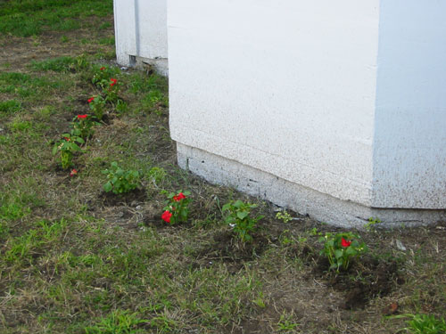 Today's garden job was installing some foundation plantings. I stopped at the nursery on the way home from my printing class and bought a couple flats of red impatiens (a nice cheap flower, grows fast, likes shade, and it won't kill me to see it blown away when the foundation work gets done). A few quick minutes later we had flowers around the base of the house. The idea is to make the house look nicer for the assessor, so she will value the house well, and we'll get a huge second mortgage that we can use to redo the foundation and rebuild the roof, and maybe also to pay for The Shed.