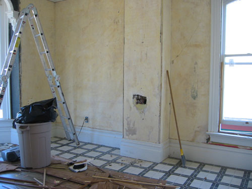 This afternoon, I started working on repairing the plaster in the Front Bedroom (the previous several days of washing wallpaper paste off the walls have been skipped out of respect for the sensitivities of my gentle readers).