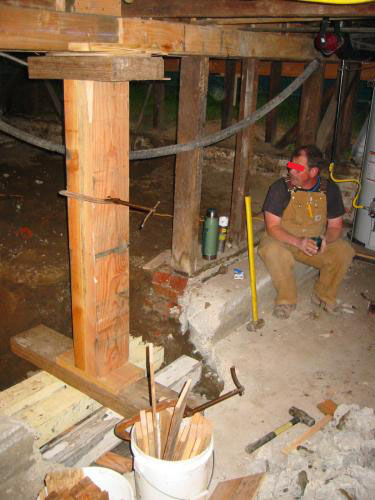 We need all of these temporary supports because of the basement dig-out. There will soon be three huge steel beams holding up the house. Those beams will come in direct contact with the floor joists. The beams themselves are held up by "cribbing" -- stacks of wood 4x4 beams which fill the space from the bottom of the beams to the ground below. The cribbing sits on a "haunch" -- a bed of several 4x4's laid side to side to form a platform that looks like a raft. Depending on soil conditions below, the haunches either sit directly on the dirt or on rock fill.
