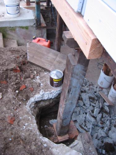 The holes are dug to the same depth as the final footings for the new foundation. Why? Because dirt likes to sag. If the cribbing was put on the existing dirt without digging a hole, you'd end up digging around the cribbing and leaving a little "hill" for it to sit on. That little hill doesn't have much strength; the dirt will want to "squeeze" out from under the cribbing. If that happens, the cribbing sinks, as does the beam resting on it, as does our house -- crack! If instead we dig down before installing the cribbing, further excavation will only bring the dirt down the same level as the bottom of the cribbing. There will be no place for the dirt under the cribbing to move.