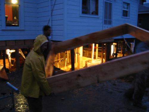 As I took pictures, they completed the next hole and sump. Here they are, carrying a new frame downstairs: