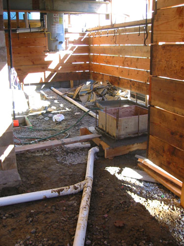 The drain field leading to the sump, which will be buried in gravel soon. This will serve to remove water pressure pushing up on the bottom of the slab by providing an easy path for drainage of water under the house.