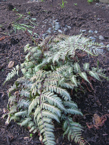 And finally, the Japanese Painted Fern, which is looking very ratty. It was taking the full force of water from the roof, 35 feet up, all spring. But it's happy now, sending out baby fronds and springing back. At one point in the spring I went out there and it was completely buried in the splashed-up compost, and I thought it would never survive. But it proved me wrong, that painted fern.