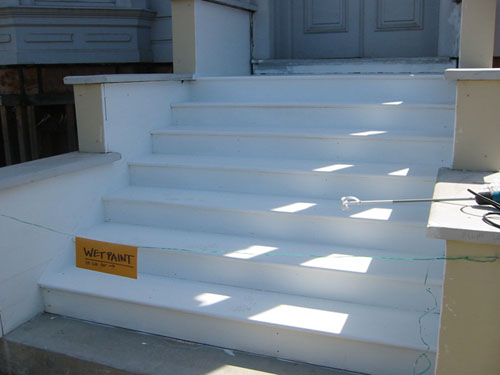 Why so many coats of primer? Because this is a traffic area, so I wanted a good protective layer there, and because primer is cheap and we had lots of it, and because I had a decent idea that we might just barely have enough colour coat to do one layer on the porch and no more.