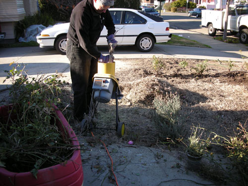 The real coup was not just pruning and moving all the roses, but getting our butts in gear and shredding all the trimmings and the huge pile of lavender from the back. It's so gratifying to take a five-foot pile of brush and turn it into a tiny pile of chipped-up bits that compost fast (you can see the pile in the middle of the photo). We did end up having to take the safety guard off the chipper to get it to work properly and not jam, but we're sensible people and no harm was done.