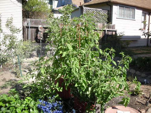 The tomatoes are feeling very exuberant these days. These two are now taller than me, and are sending branches out to try to get unsuspecting passers-by. They're covered in baby tomatoes and flowers, too, so we're totally ready for a massive crop to come in, probably perfectly timed to arrive just as we head out East for vacation next month.