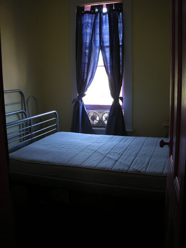 Then, without hesitation, we put down a couple of rugs (since we would not, obviously, have time to paint the floor before our houseguest arrived), moved in the bed and some other furniture, and then emptied the crammed hallway back into the room. Much of what we had stored in the hallway was boxes of art supplies, so they just slid under the bed. There were also a ridiculously large number of tripods and silkscreen frames and other bulky-ish items that fit nicely back in a corner.