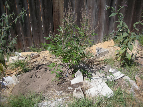 Anyway, this weekend Berkeley Hort has deciduous shrubs 50% off (both 1-gal and 5-gal, but mostly 5-gal), so we popped over there this morning and threw down a bunch of money for six fine new shrubs (only three of which were deciduous, but you know how that is). Only one of those was a replacement of one I'd killed once before in this garden, so that's pretty good (and it was the dogs that did it, really).