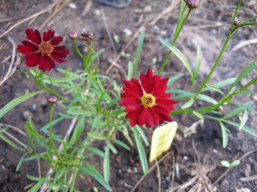 That is Coreopsis tinctoria 'Mahogany', one of the many plants I picked up at Annie's last weekend. Coreopsis is a real champ in this climate, and I am looking forward to it blooming all winter long as advertised.