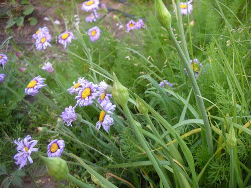 A nice little vignette: some of the alliums in bud, with the Felicia elongata in bloom. The felicia has the distressing habit of just sort of looking rumpled like this all the time. I'm not sure what to make of that.