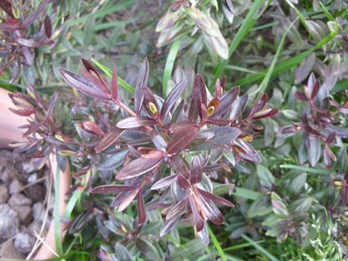At the back of the garden I have this little brownish hebe that is having a very subtle growth spurt. I like how the new growth is greenish and matures to dark red. I have a lot of hebes in the yard, because not only are they pretty, but they pretty much love this climate. I like not having to worry about watering a plant after it's established, and still getting nice flowers every year.