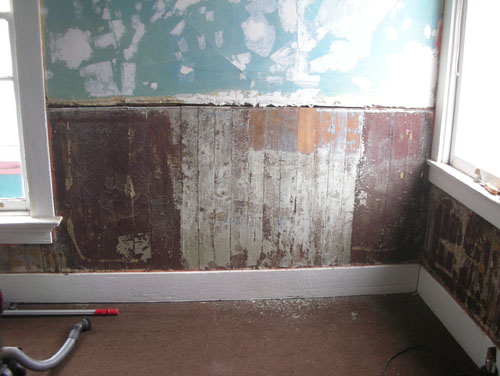 Last week, while I was away, Noel began scraping the mastic off the wall of the back bedroom. This is a test area: he used the heat gun and scraper and removed the heavy material (that reddish-brown stuff you can see to the right), then used the sander to get down to wood.