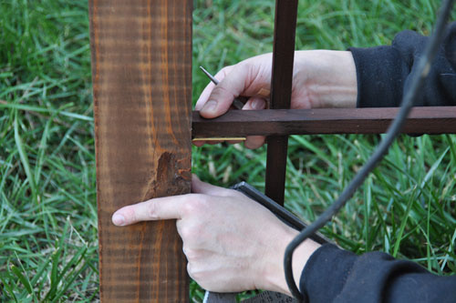 While I did that, Noel added the two trellises to the sides of the pergola. The trellises I bought from the local nursery were not perfectly symmetrical, so he had to trim some bits to fit.