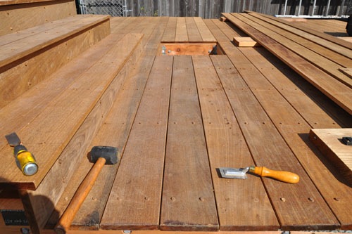 My progress was pretty imperceptible, I would say. I knocked down most of the plugs on this area of the deck, but had a few plugs split on me or break off below the deck surface. Noel showed me his fancy trick for chiseling off the top, then sawing it flush with the little saw, then sanding, but it did not turn out the same for me.