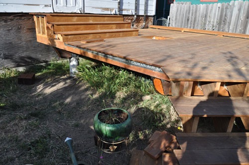 When he'd cut the end off, he put some sealer on the ends of both beams to keep them from getting bad. The pressure treatment doesn't go all the way through the wood, so you need to seal any cut ends on PT wood. Usually you'd use a special pressure treated wood sealer, but the same end sealer that we used on the ipe works just fine, too. The more open grain of the pine takes a lot more of it, though.