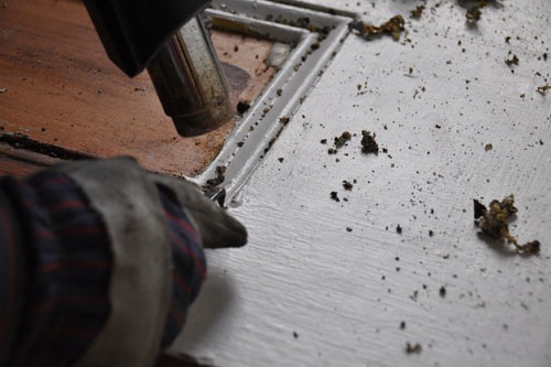 I swear that dog is going to end up injured from her habit of lying right under us while we work, but so far so good. Apart from getting a bunch of old wallpaper stuck to her once, she's been incident free since starting on the job in 2005.