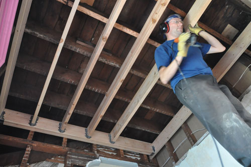 It was a horrible experience, anyway. It turns out that the wood we got from Home Depot yesterday (because Economy Lumber was closed) was milled a little larger than the wood we already had. So when it looked initially like things would just fit together nicely, instead Noel spent a bunch of time carving down the existing joists with the Fein Tool. Fun times.
