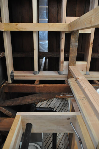 The question was where we would run things like the plumbing vents and the drain from the toilet, and it looks like this time the framing lines up just right to make a nice straight run down.