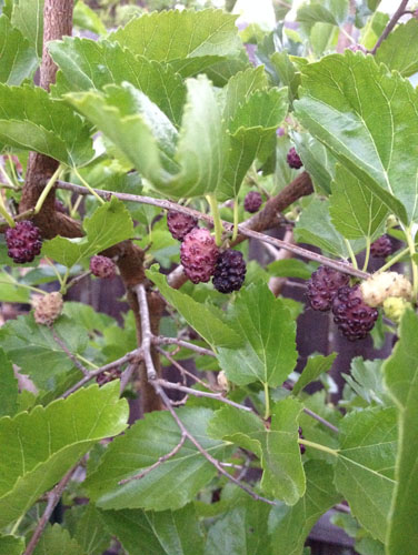 In fruit right now in the garden: pink mulberries. They are not very "pink" except when compared to regular black mulberries. I love the light, sweet flavour. The tree isn't quite big enough to give us enough for jam yet, but maybe next year.