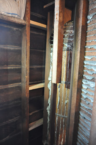 In order to install the upstairs toilet tank, we need to have a wall that can hold it. In order to make that wall, last week we removed a bunch of the existing wall. Today we began slowly putting it all back together again.