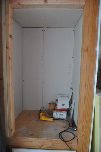 With the clips in place, it was a matter of a couple of hours of fiddling around today to drywall the entire closet (and a little bit of finishing up other drywalling). Now I can go in there and have some quality time with the drywall tape and mud, and soon we will have a coat closet again.