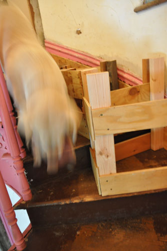 Noel thought the boxes should be smaller than the stairs, so as to allow cats and dogs to go by, even if they have to do it on the most scary part of the stairs. In the past when I have set up the scaffolding, animals have been trapped wherever they were when I set things up, and there has been DRAMA about NEEDING to be upstairs or downstairs. This makes it easier for us to get by the scaffolding, too, which is nice for going to the bathroom.