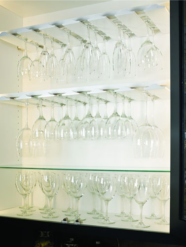 These stemware hangers are readily available (this one is sold by Hafele, who make all kinds of cabinet accessories), or you can make them very easily, and they make storing stemware very easy.
