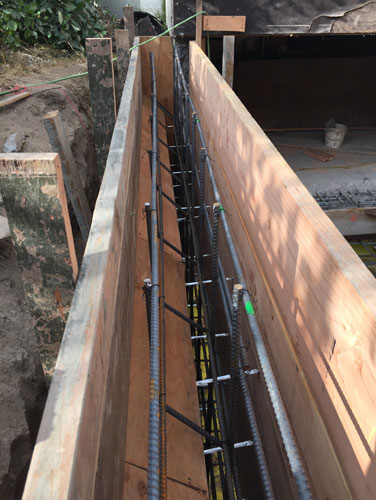 OK, planning redesigning my house aside, it's really nice to see the foundation comping together. Just to tell you what you are looking at here, this is a formed-up wall. With a concrete wall you build it twice: once in reverse, then again in concrete. The contractors put up one wood wall, then built the rebar that will reinforce the concrete, then put up the inside wood formwork. The two sides are tied together with form ties. Those keep the formwork from bulging out of shape (which at the least would require more concrete which you may not have).