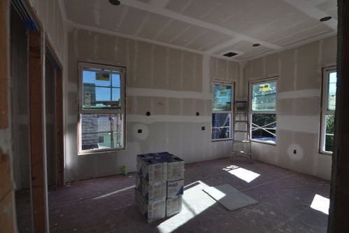 In the meantime, drywall has been continuing, slowly. The extra moisture in the air has been making the mud slow to dry which is a little frustrating. We can't even turn up the heat to help it out, because the heat is not installed yet.