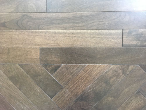 Here is the border between the herringbone field and the wood strip edge in the front parlour. The room has a border of 5 strips of wood around the herringbone, which makes it easier to hide weird non-rectangular corners of the room and walls that aren't perfectly straight.