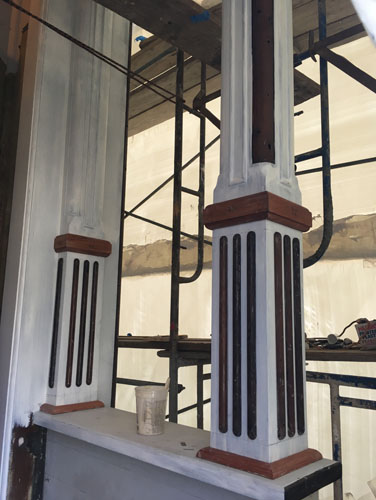 Today I went by to see the porch, and Woody was there, reinstalling the reeds on the columns.